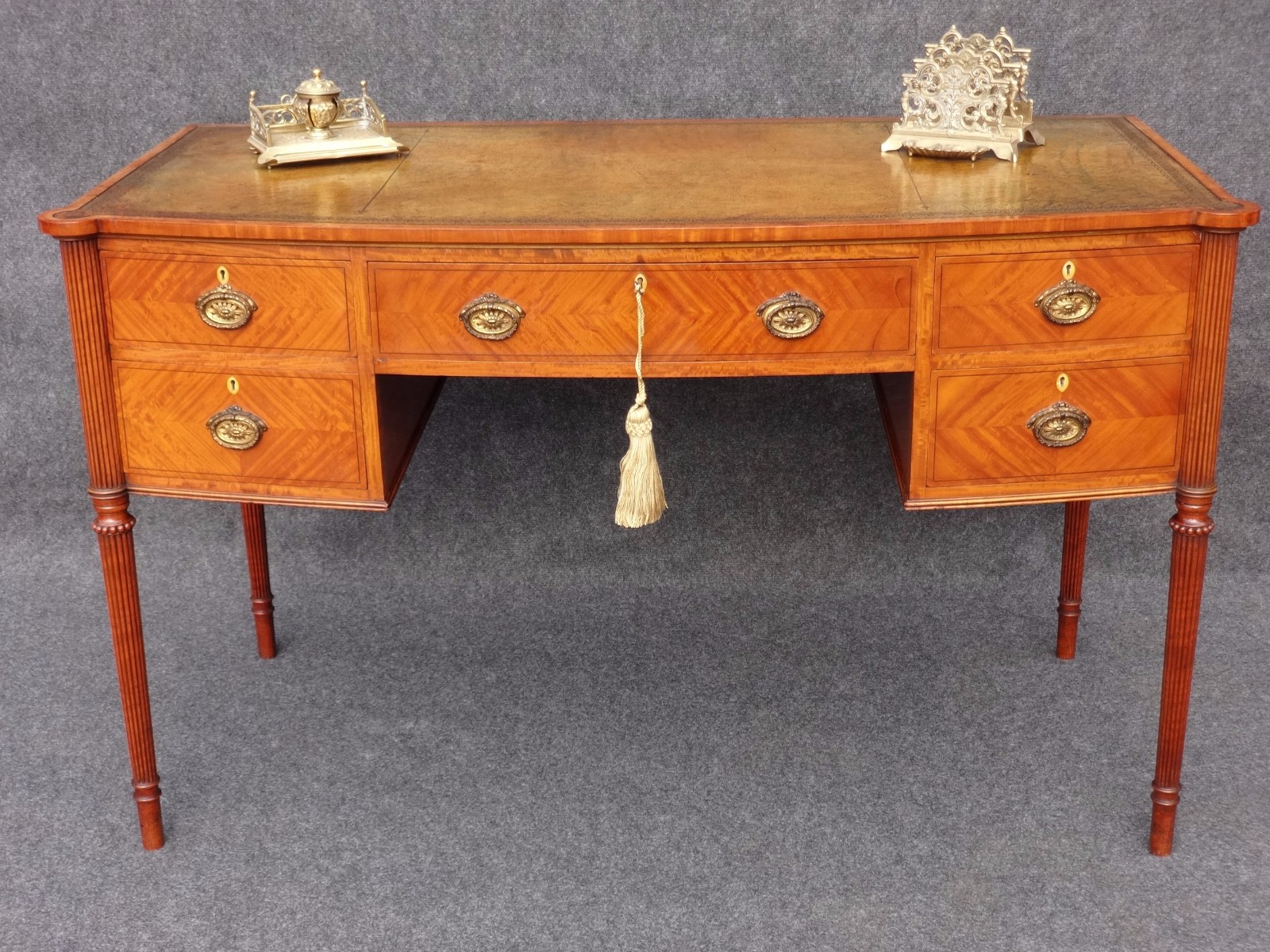 5 drawer bowed satinwood desk inlaid with ebony stringing, ivory escutcheons, green leather top, in excellent original condition.