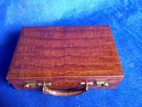A vintage leather briefcase with a stationery compartment, a seperate original address book, brass hinges and locks with gilded with the initials D.L.B.