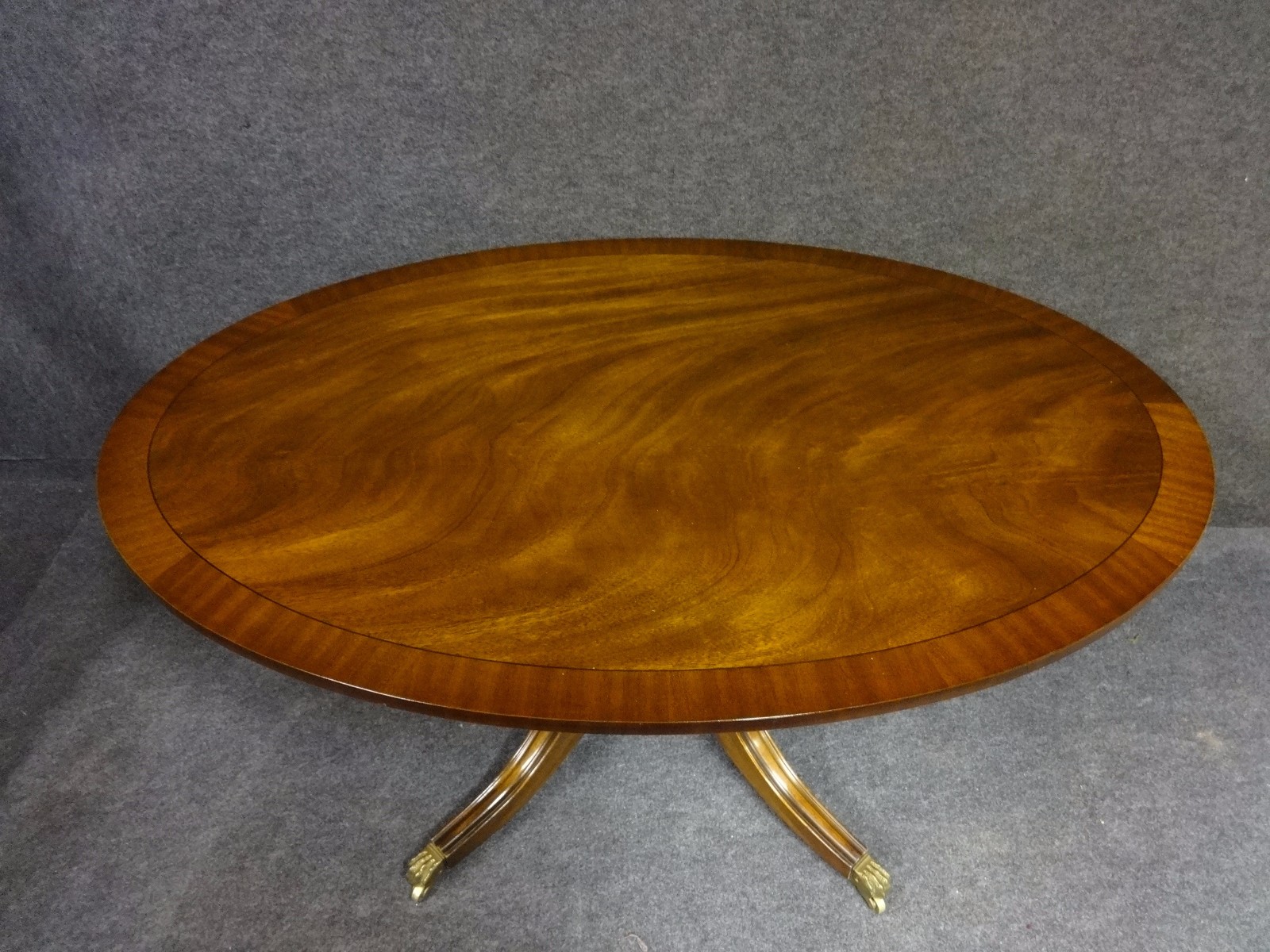 This is an excellent quality mahogany coffee table which stands on turned column with 4 splayed legs terminating on brass toes and castors. The top has fantastic figuring and it has recently been re-polished.