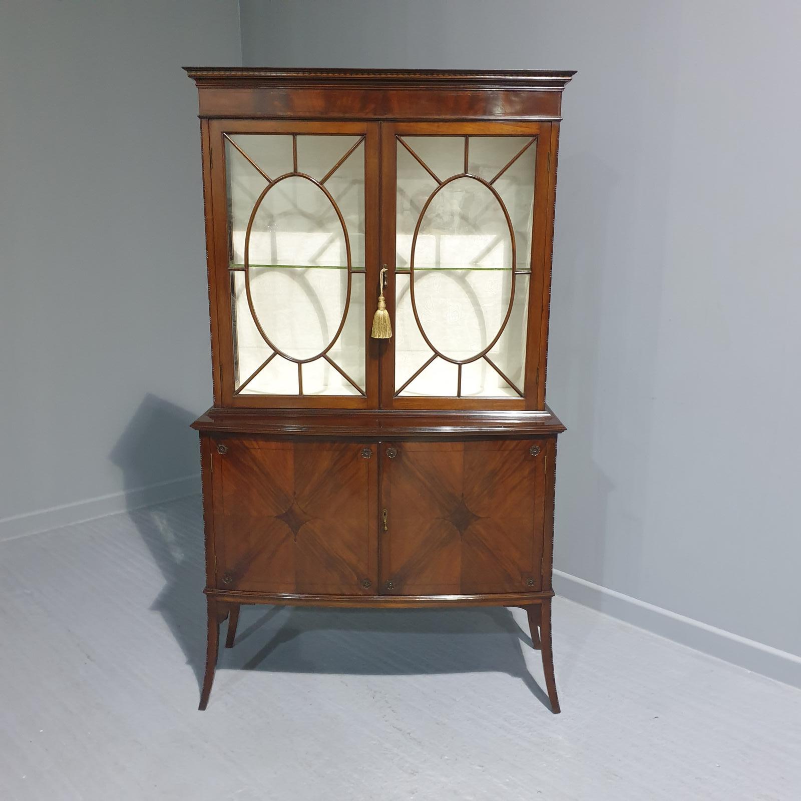 This is a very nice Edwardian antique inlaid mahogany display cabinet with cupboard below, standing on outwept legs, recently relined in cream, single glass shelf, splits into two for easy of transport, in excellent condition.