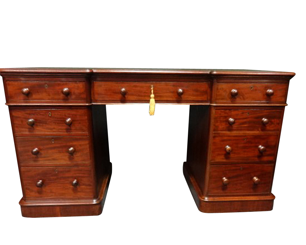 An excellent quality eight drawer breakfront mahogany pedestal desk, mahogany lined drawers, original locks, in very good original condition.