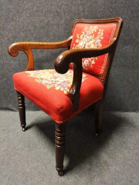 Covered in a very good quality woolwork, this is a very good quality fiddle mahogany desk chair, good colour and in very good original condition.