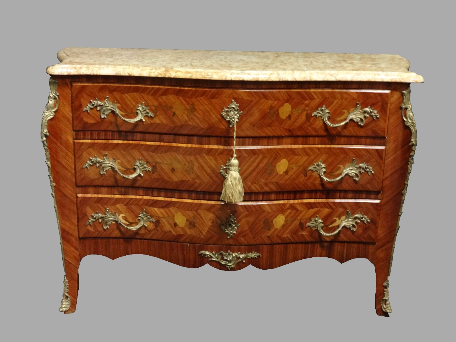 This is a very good three drawer serpentine tulipwood chest of drawers with ormolu mounts and handles, marquetry decoration to drawers and sides, cream coloured marble, oak drawer liners, in all excellent condition.