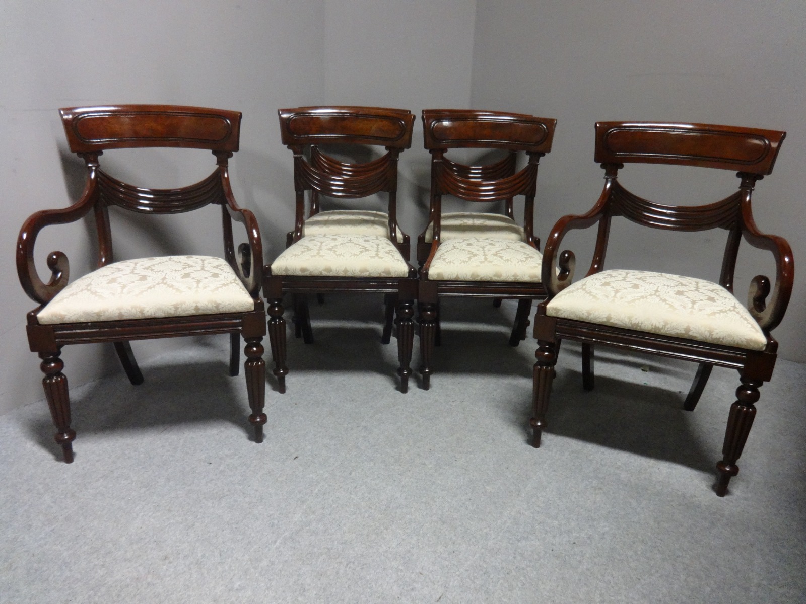 A Great set of six William 4th dining chairs, four single chairs and two carver chairs, lovely swag detailing to the back, curly arms to the carvers, recently upholstered in pale gold damask, excellent colour and condition.
