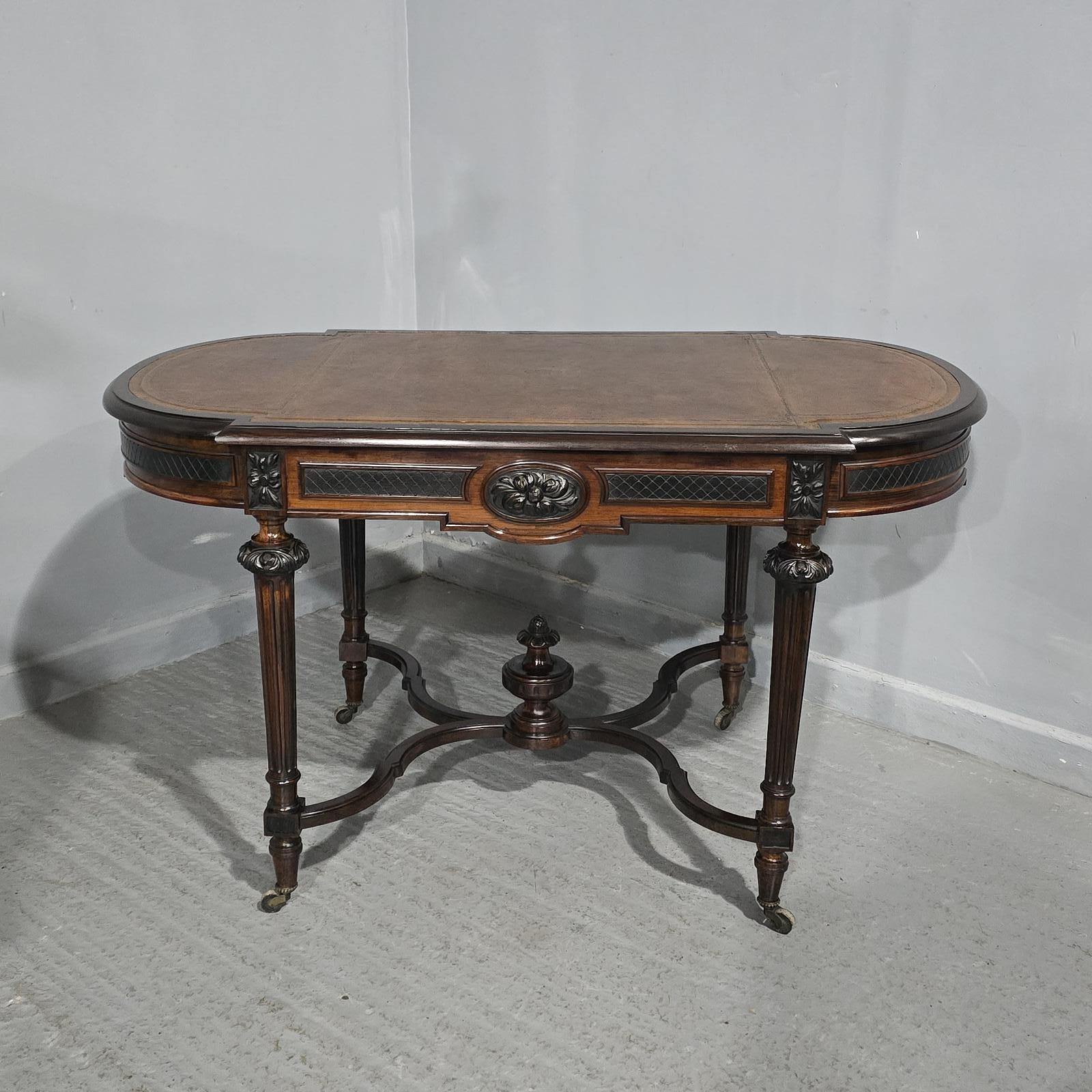 This is a superb quality 19th Century antique rosewood library writing table, or centre table, freestanding with full width drawer and tan coloured leather, in outstanding condition.