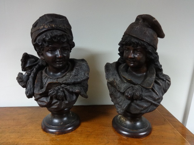 These are a good pair of Terracotta busts on socle bases, with impressed marks S.H which may be German manufacturers Simon and Haldberg, numbered 737, 738, and in excellent condition.