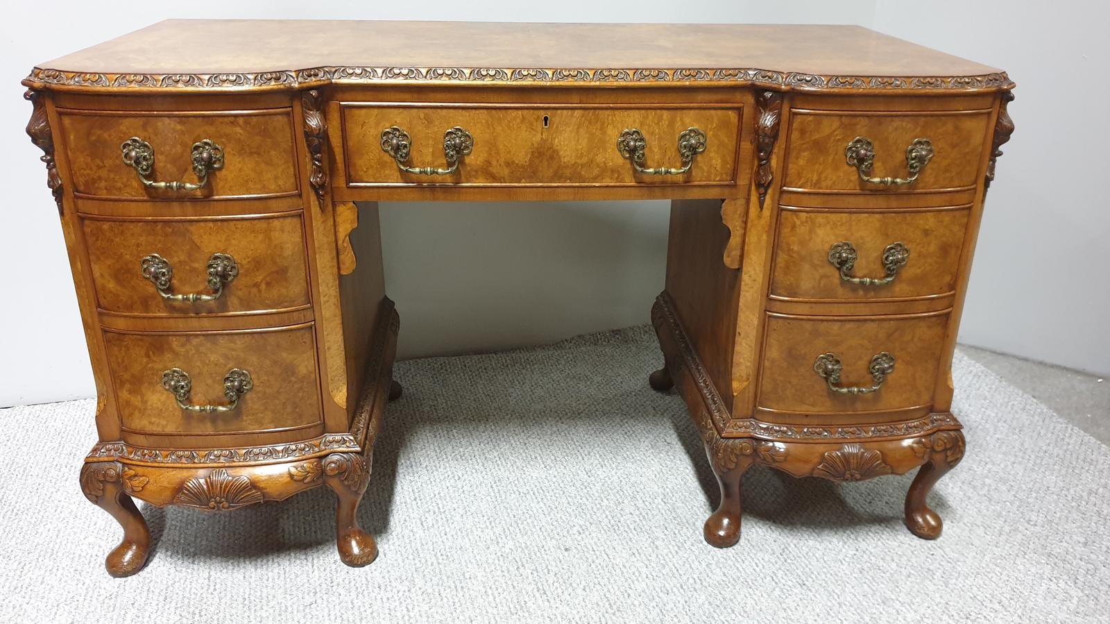 This is a top quality burr walnut breakfront desk, with brass handles, excellent carvings, freestanding, excellent colour and condition.