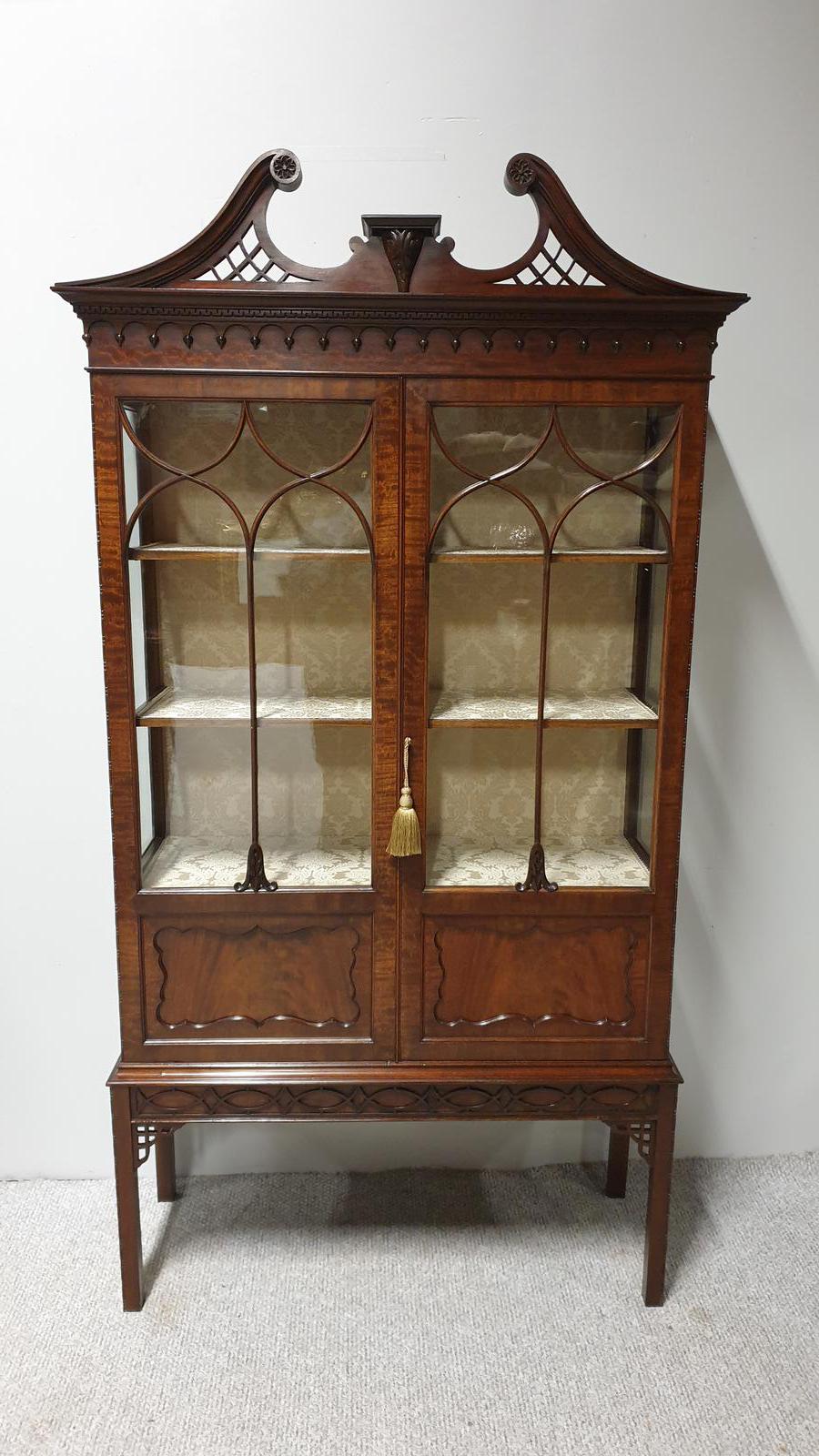 A super quality Chippendale style mahogany display cabinet with cream damask interior, excellent colour and condition.