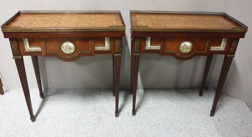 Superb pair French kingwood and parquetry inlaid card tables with porcelain plaques, ormolu mounts, each with a drawer to the end, baise lined, great all round condition.