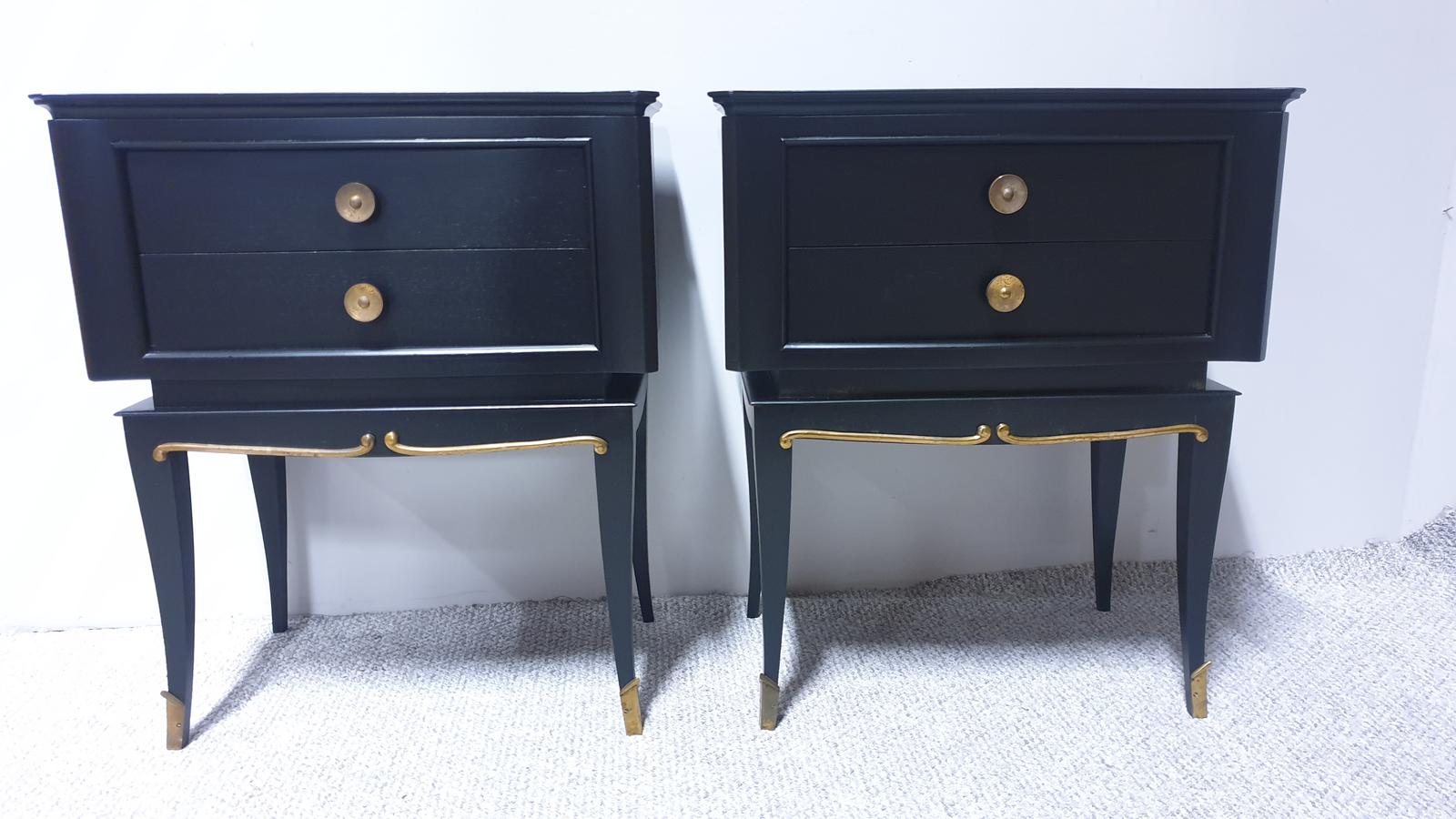 A superb pair of Italian black Art Deco bedside lamp chests of drawers, very stylistic with brass toes, handles and S shaped details, in excellent condition.