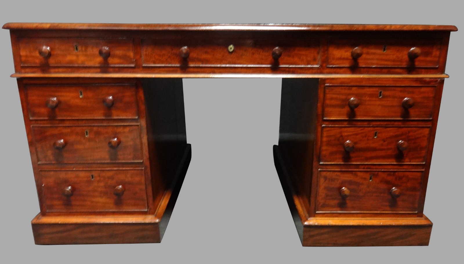This is a very good 19th Century Victorian antique mahogany desk three part, nine drawer, dummy drawers to the rear, solid drawer linings. It is in very good condition.
