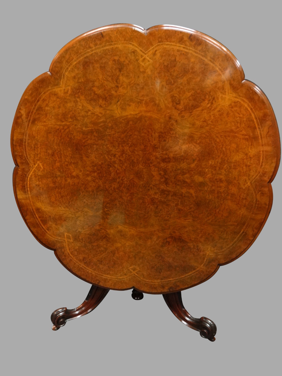 A very good Victorian burr walnut dining table, shaped as a petal, standing on pedestal base, top and bottom both stamped with same number, superb colour and condition.