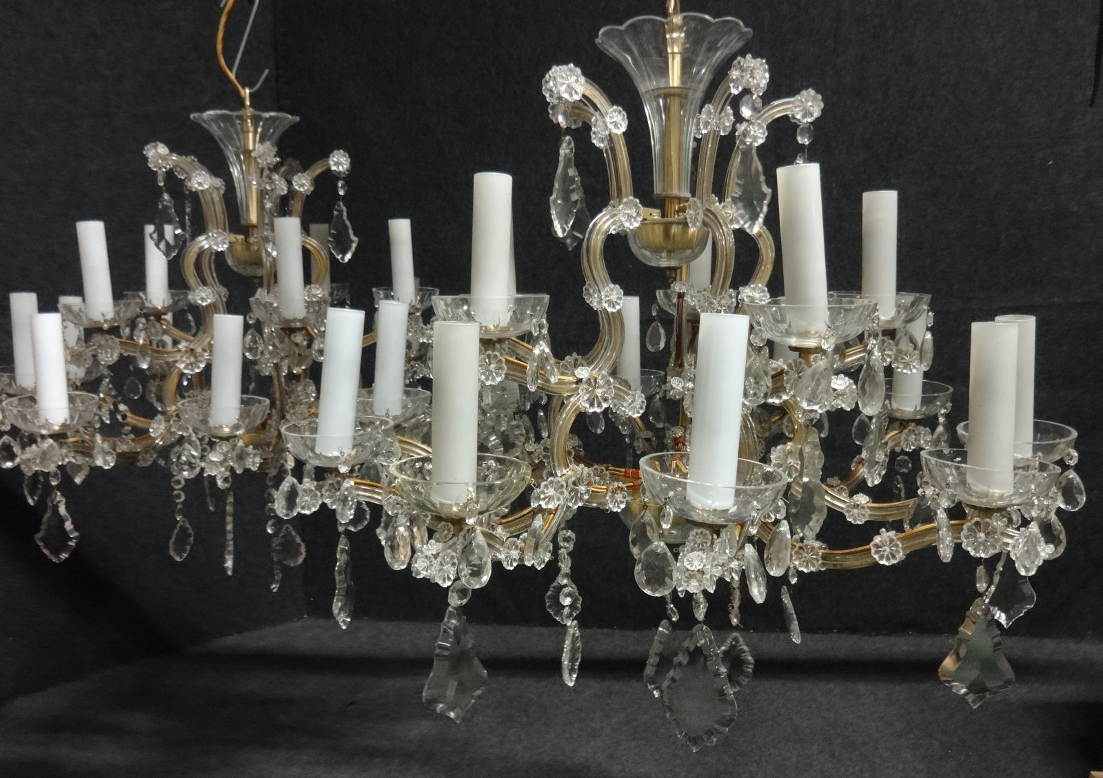 These are a superb pair of fifteen branch cut glass crystal chandeliers, glass bulb shields, in very good original condition. Glass branches.
