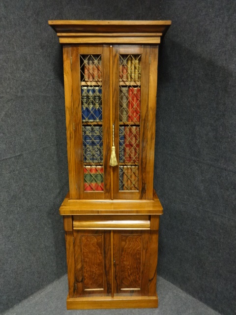 This is a good figured walnut bookcase on cupboard of slim proportions, having two door base with full width drawer and with a single shelf inside. The top has three adjustable shelves and brass grilled doors.