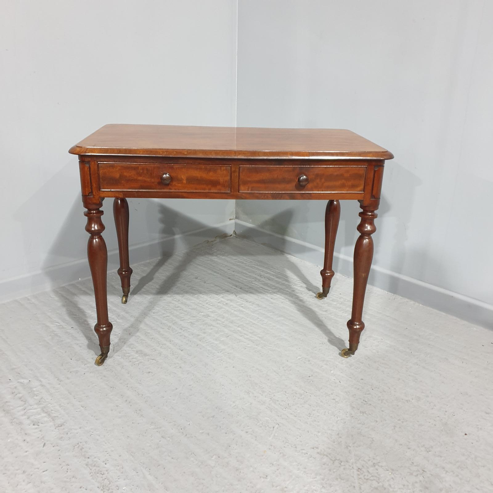 This is a very nice mid 19th Century Victorian antique mahogany side table with two drawers, and dummy drawer to the other, brass cup castors excellent colour and condition.