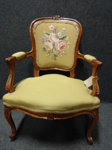 Offered for sale is this very pretty French antique boudoir chair with exquisite needlework panel.