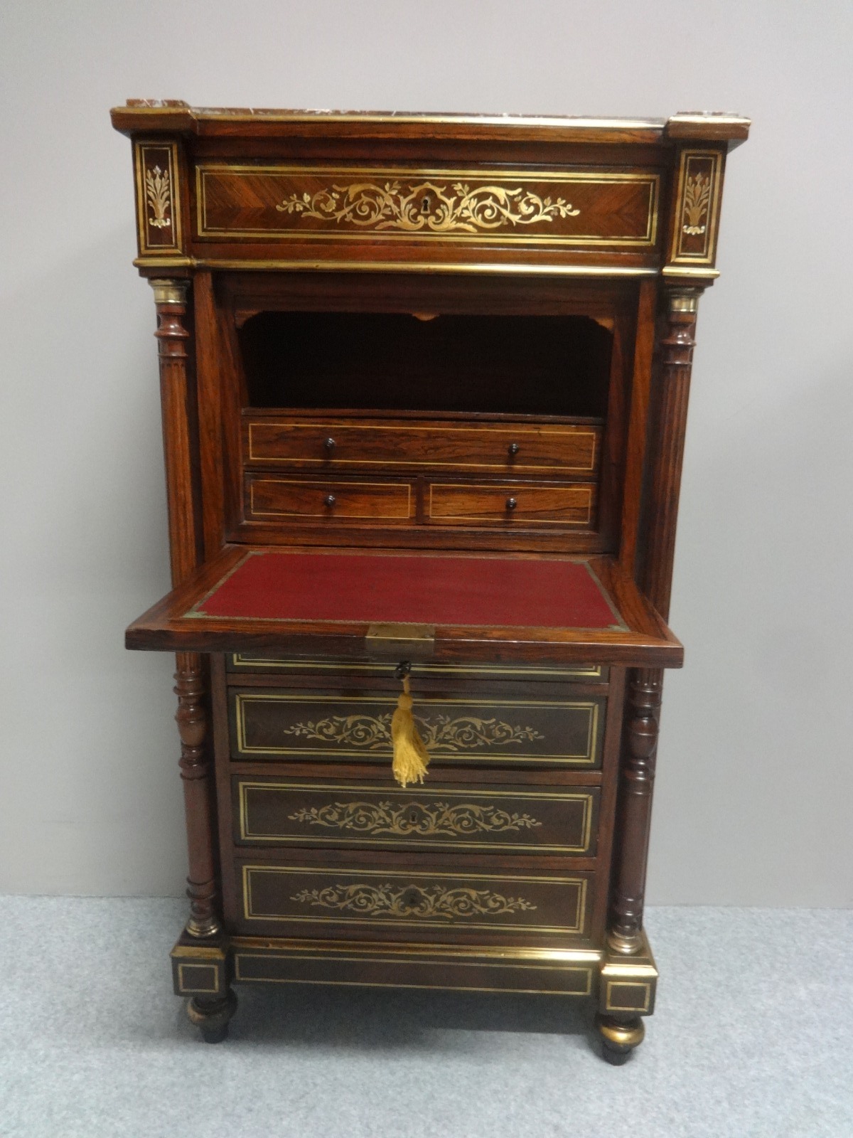 This is a very good 19th Century French antique rosewood escritoire bureau, in excellent condition inlaid with brass, mother of pearl and bone, rouge marble top, beautiful and useful piece of furniture.