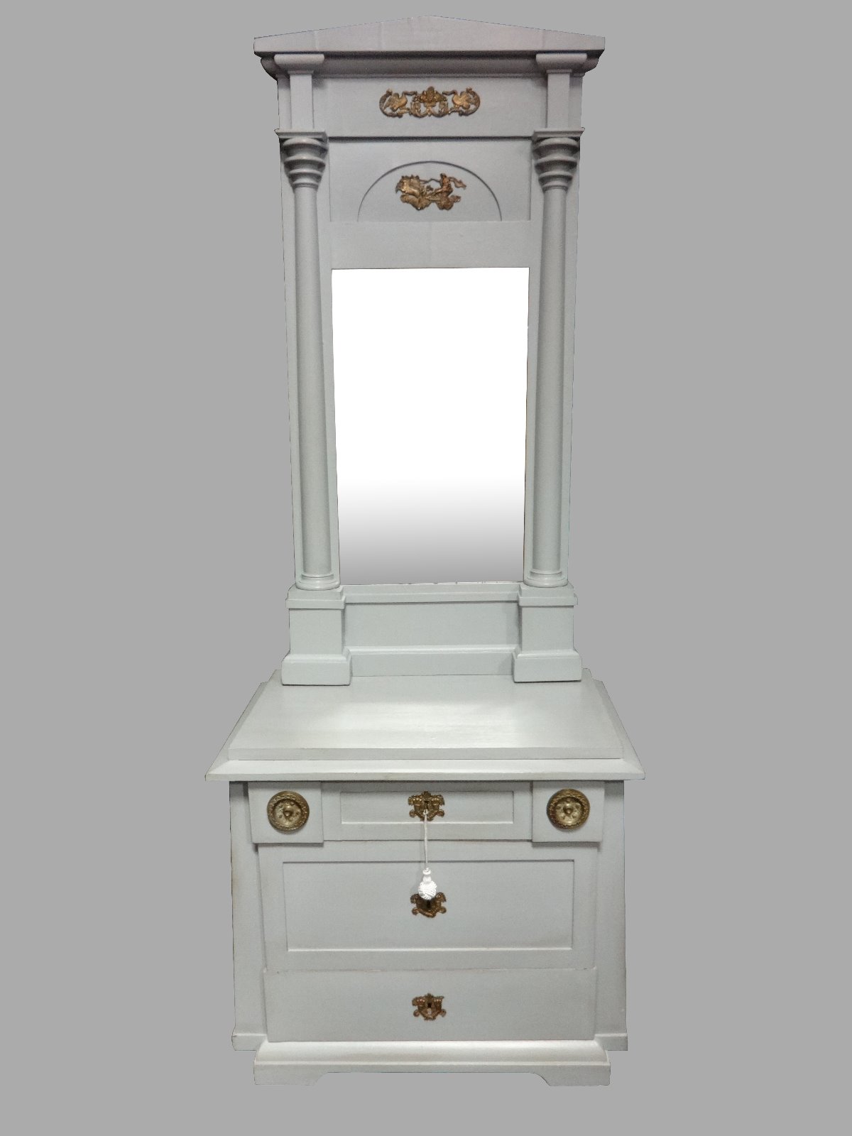 This is a good Empire chest of drawers and console table, painted in grey, blue lined drawers, original key, blemishes to the mirror, splits into two.