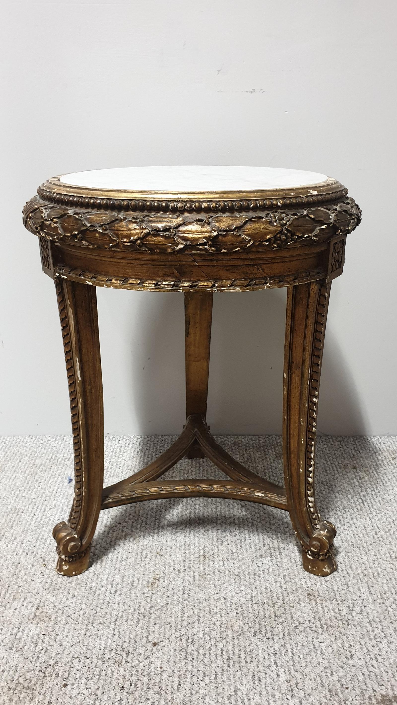 A very good original carved French gilt lamp table, with original marble top, in very good condition.