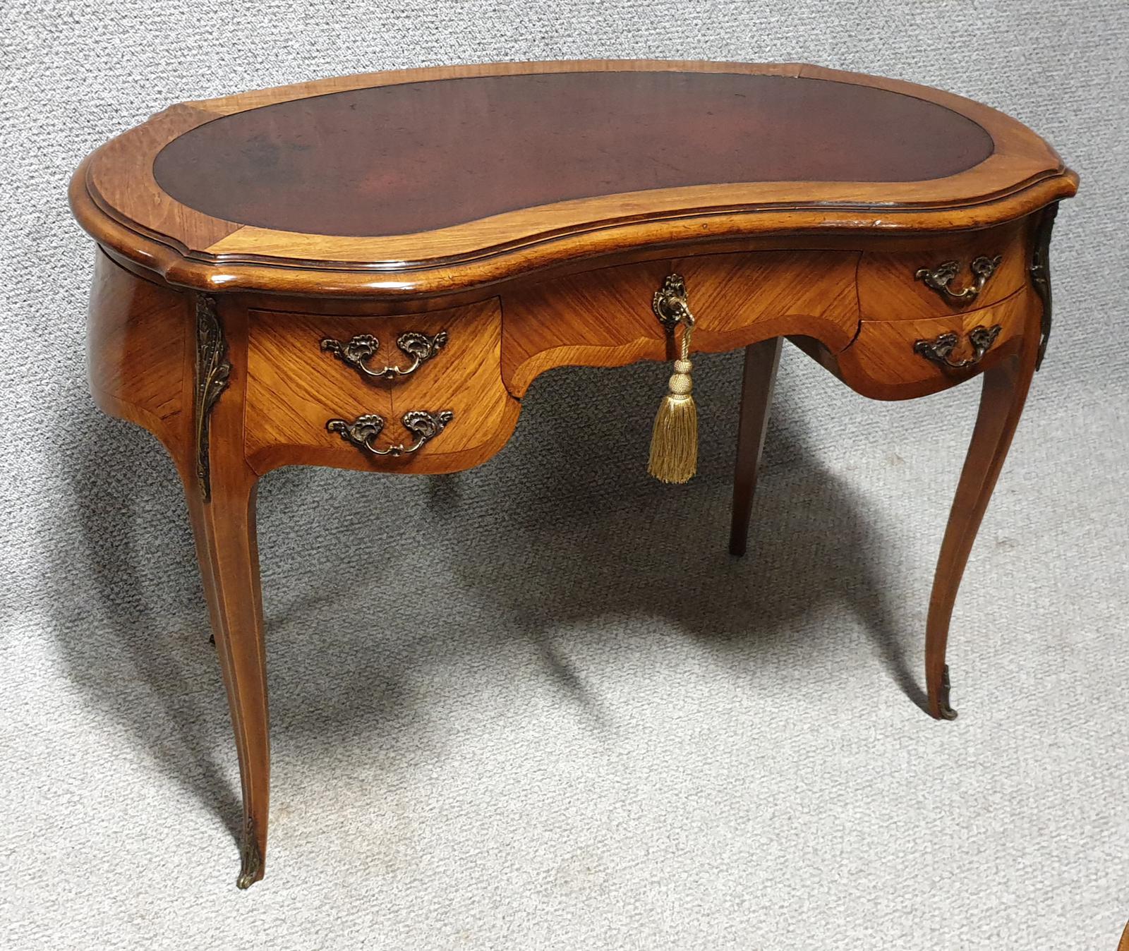 Fabulous French tulipwood kidney shaped desk with pull out slides on each side, ormolu mounts and handles, freestanding, excellent colour and original condition.