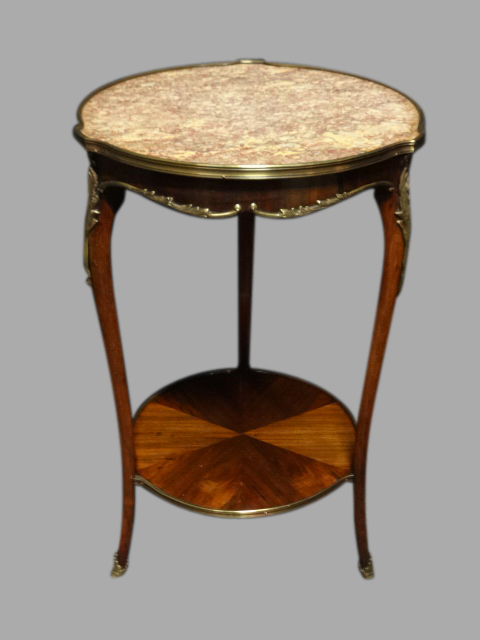 This is an excellent quality French antique kingwood table with very good marble top, brass mounts to the edges and legs, in superb original condition.