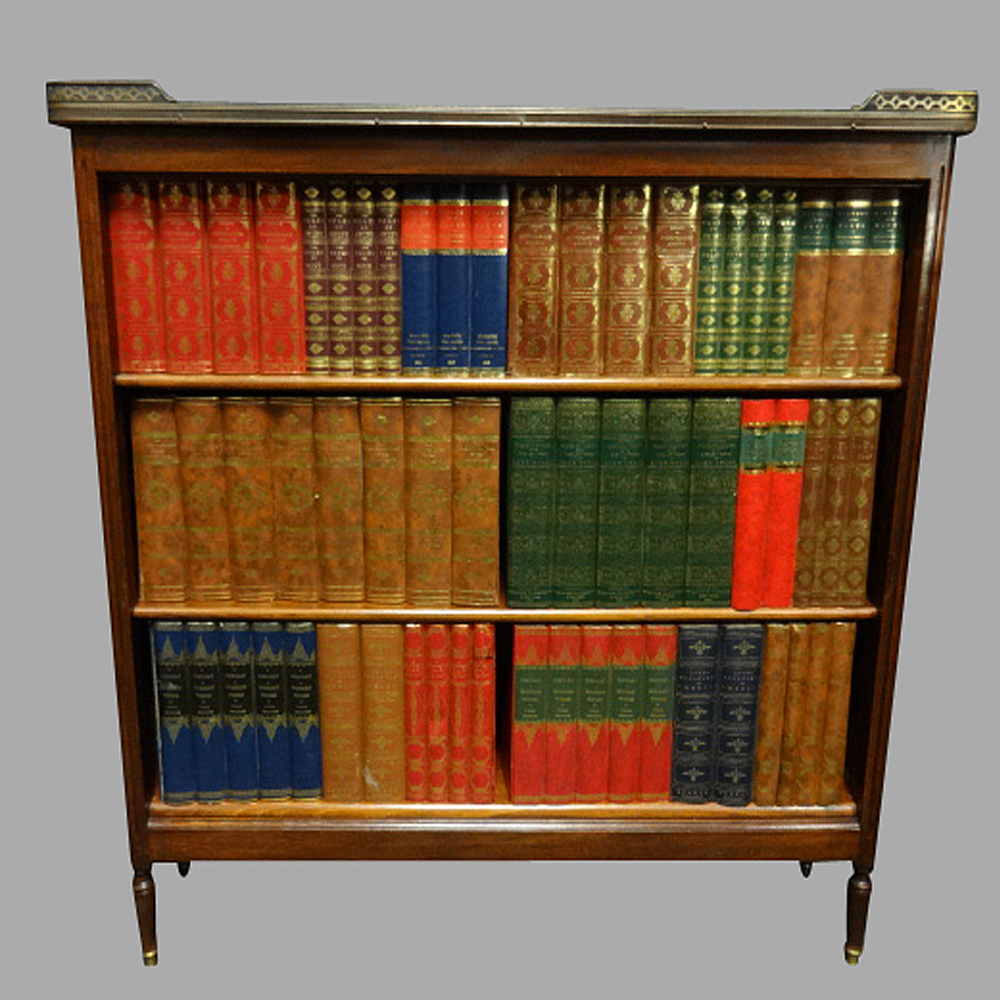 This is a very good French open bookcase, two adjustable shelves, brass beading to the sides, brass feet, brass fretted gallery and marble top, in excellent condition.
