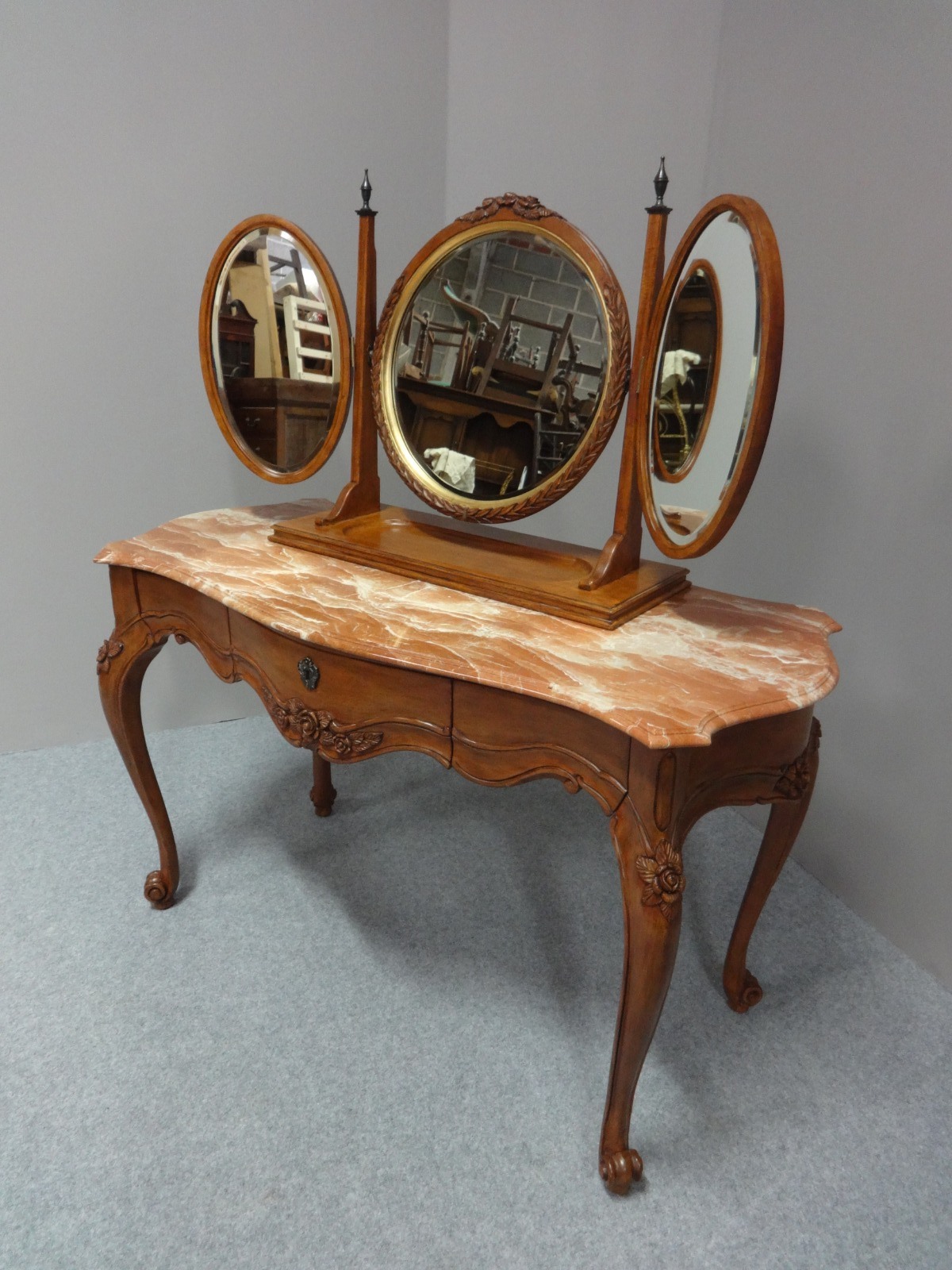 This is a very pretty walnut three drawer freestanding dressing table with marble top, removable three mirror top, in excellent condition.