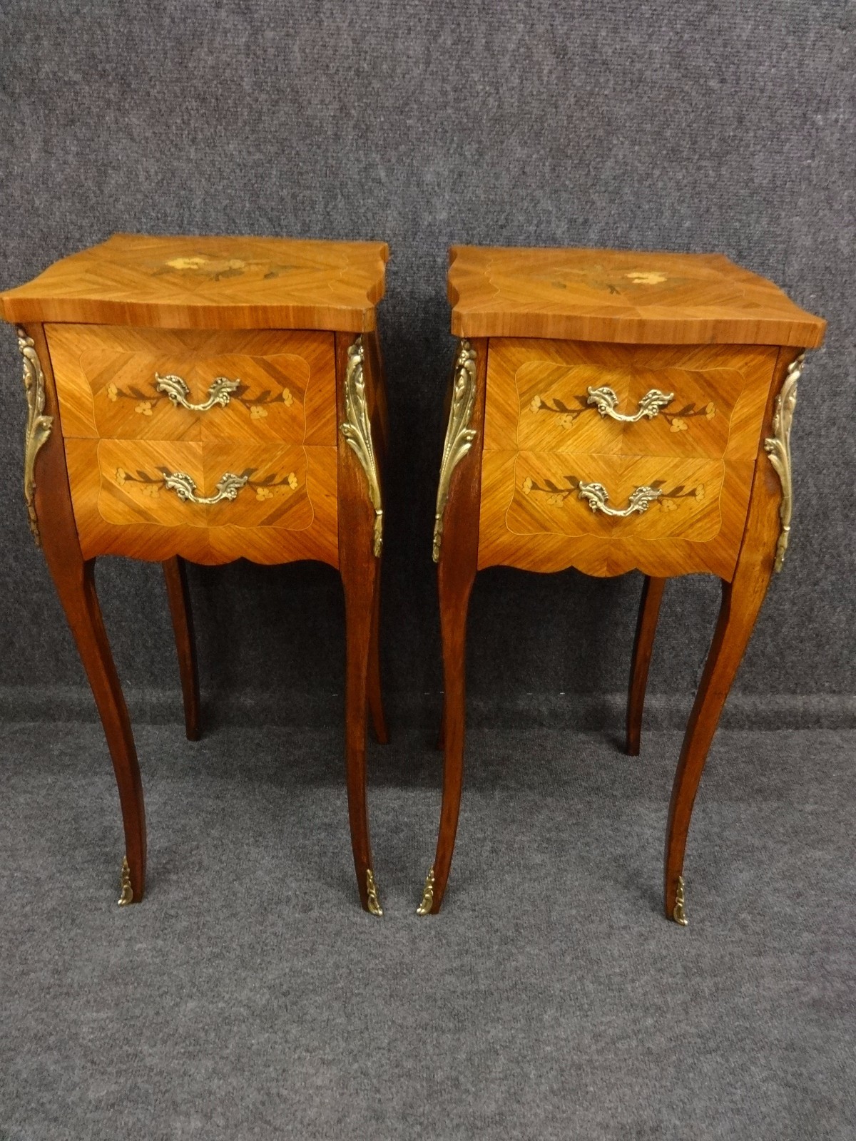 This is a good pair of French marquetry chests, with 2 drawers, serpentine shaped, good ormalu handles, and mounts, oak lined and in excellent condition.