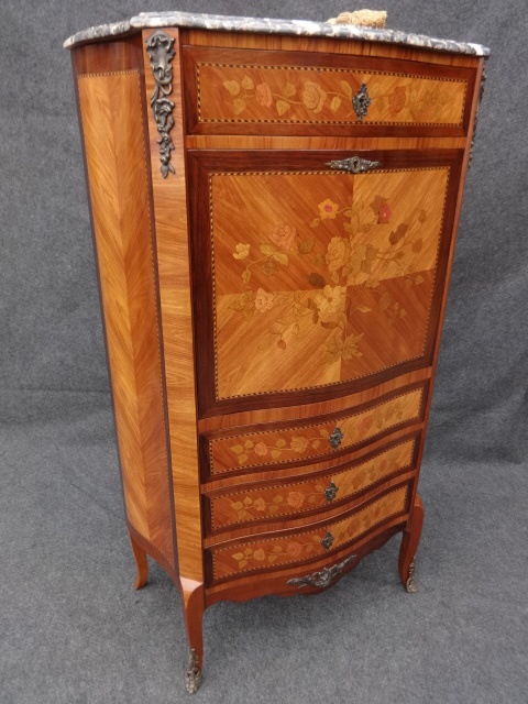 This is a fine French antique secretaire abattant, rosewood and tulipwood inlaid with marquetry flowers and foliage, serpentine front with top drawer and 3 lower drawers, all with ormolu handles and feet, drop down bureau with drawers and pigeon holes and black leather writing surface, good grey and buff veined marble.