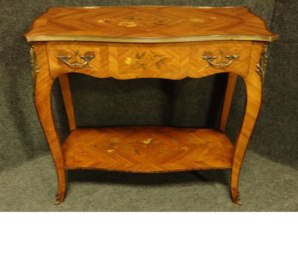 This is a good French kingwood and tulipwood freestanding side table with drawer with marquetry decoration, gilt metal mounts, handles and edging. It is in very good original condition.
