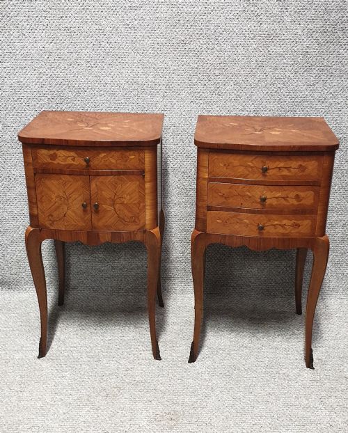 A lovely pair of French tulipwood and marquetry inlaid bedside cabinets, one with all drawers and one with single drawer and cupboard. Ormolu fittings, excellent colour and condition.