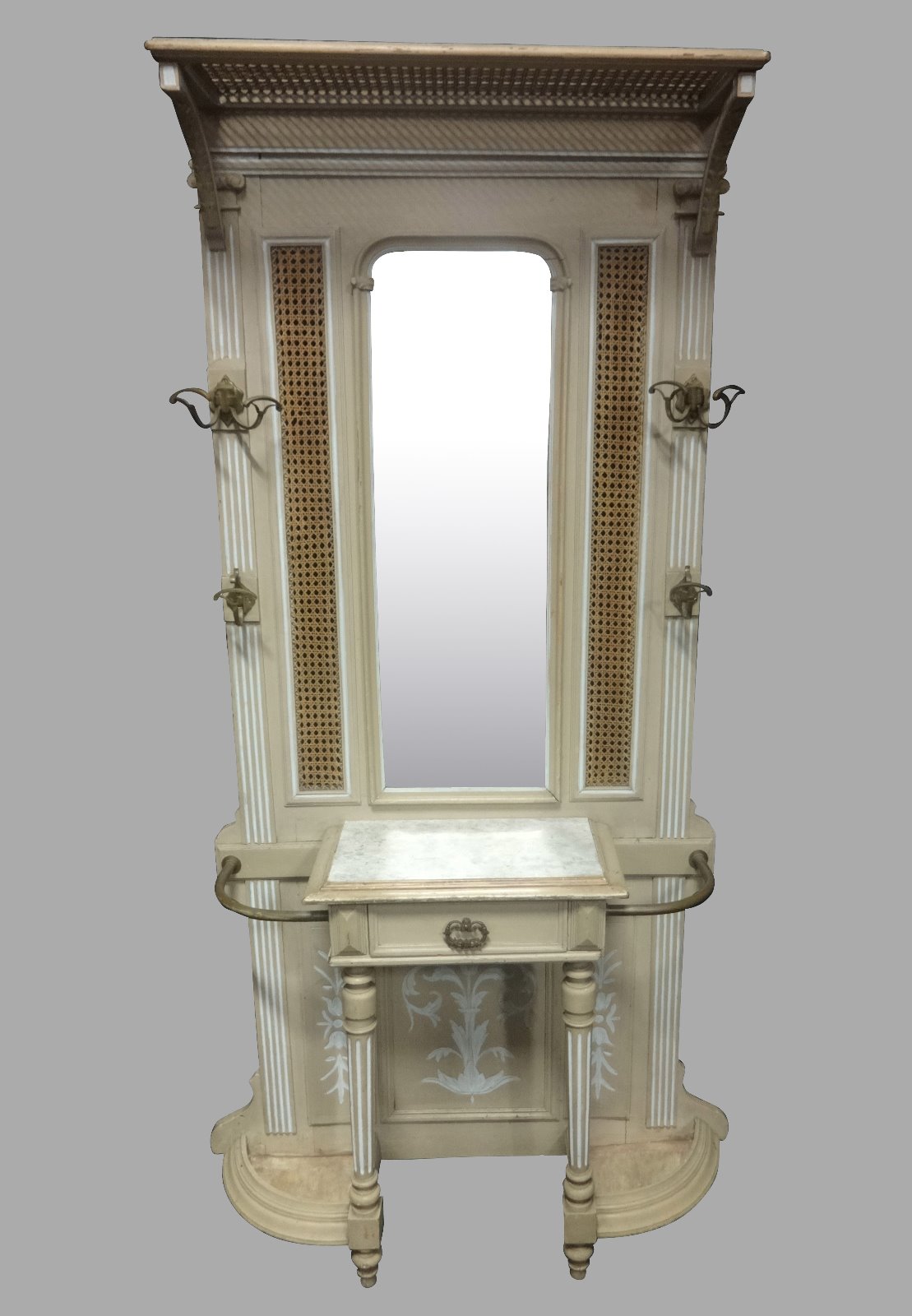 This is a good French painted hall-stand with bergere panels, original mirror and brass hangers, in good overall condition.