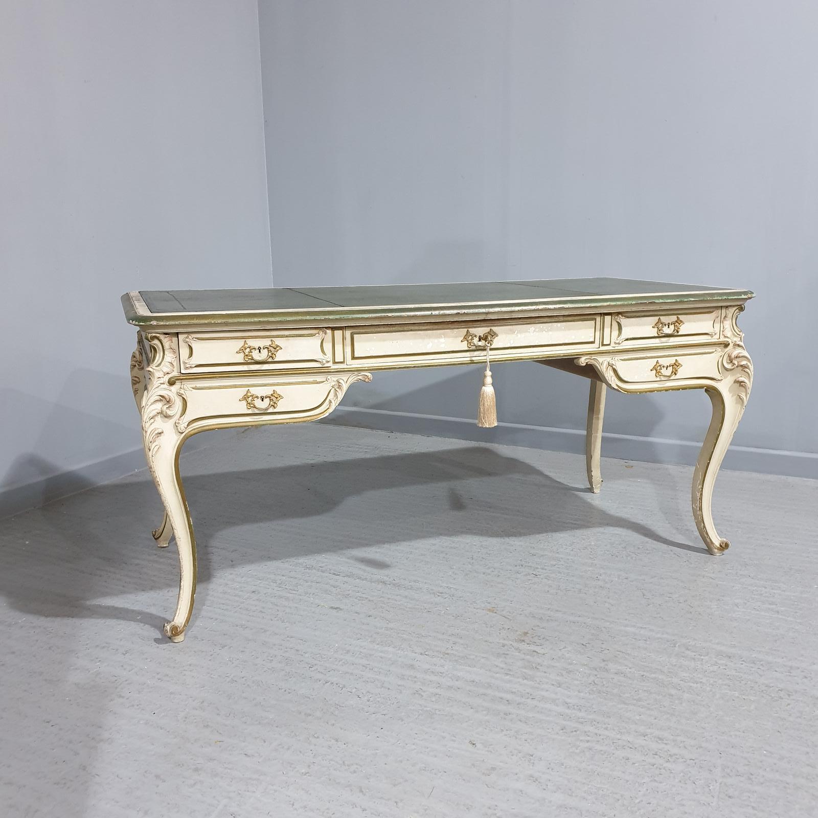 This is a large and very good French original painted writing desk with five drawers, original green leather, ormolu mounts, freestanding, in very good overall condition.