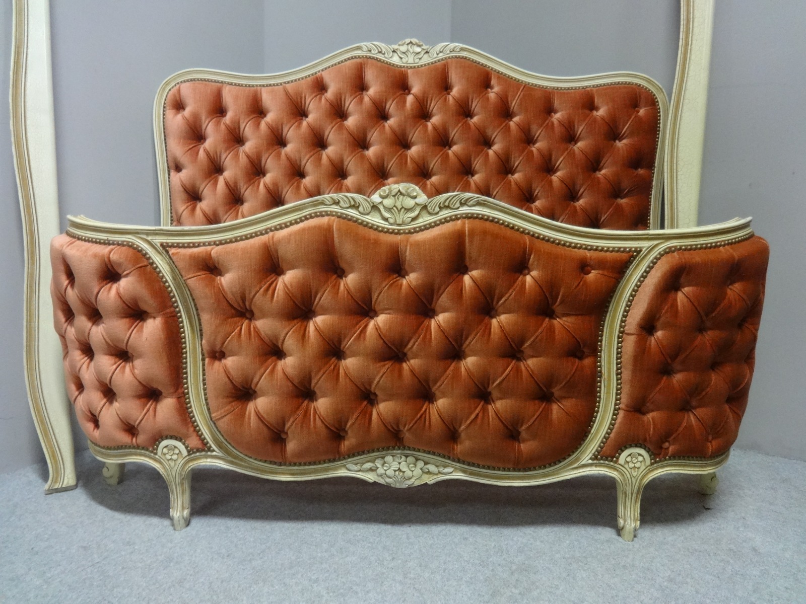 This is a very pretty French painted curved bed with deep button, upholstery in excellent condition.