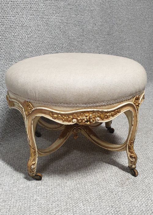 A very pretty French 19th Century antique parcel gilt and cream painted round stool, covered in oatmeal linen, wooden castors, in very good original condition.