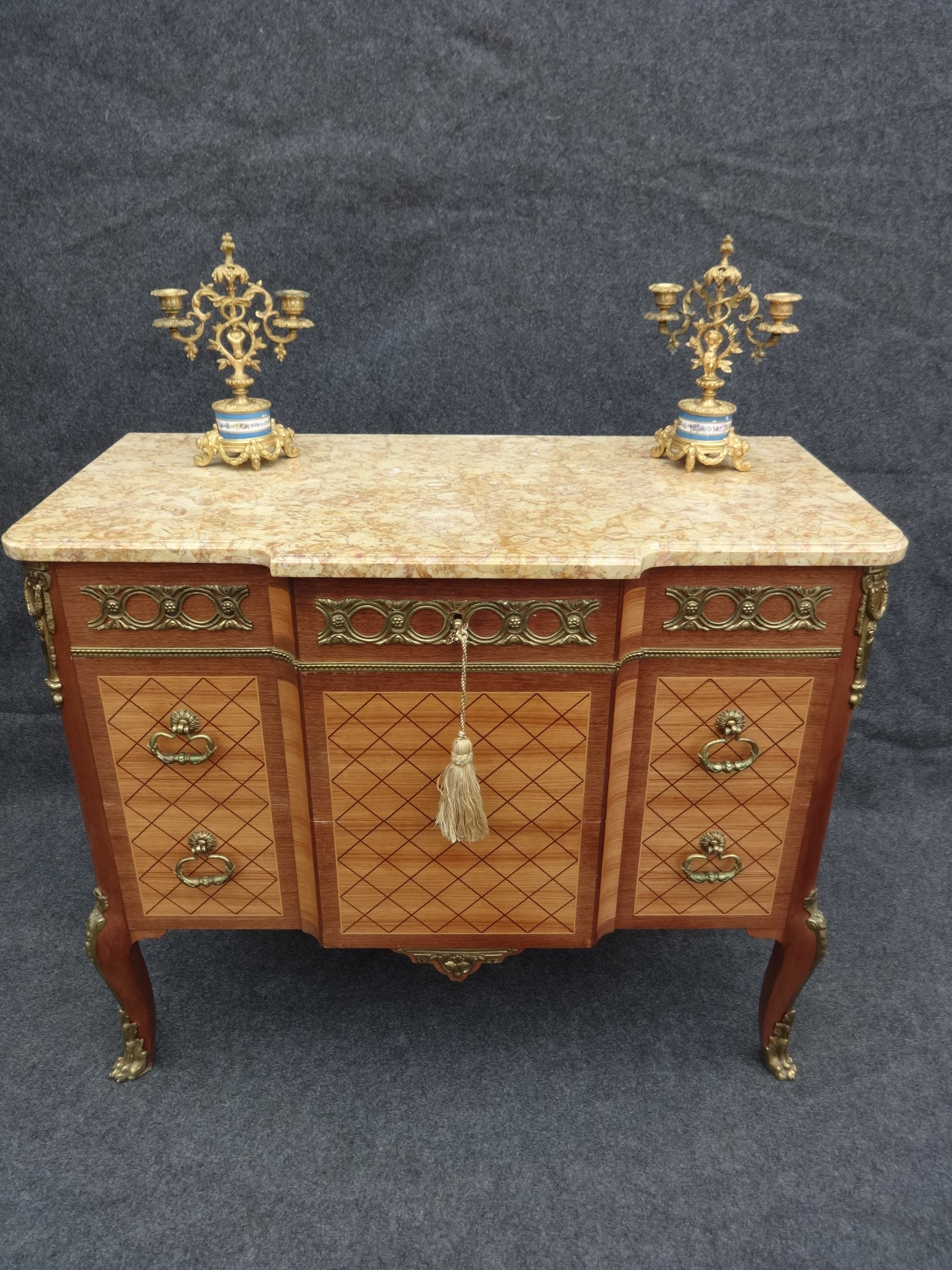 Stunning breakfront commode chest of drawers with parquetry detailing, 3 drawers with original key, oak lined, with top quality ormalou mounts, superb quality marble.