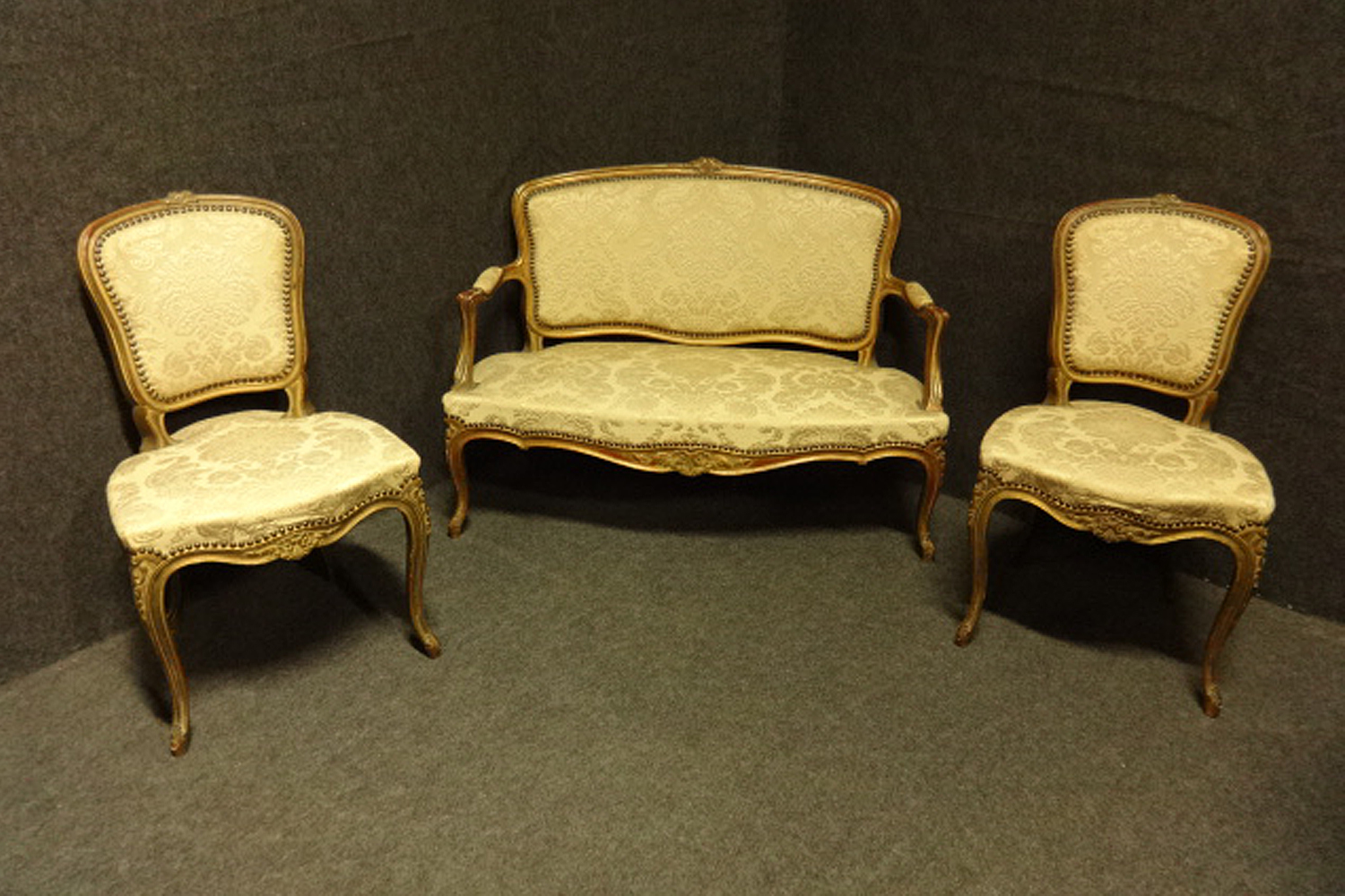 This is a gilt three piece French salon suite, carved floral decoration, pale gold damask upholstery, standing on cabriole legs, in very good original condition.