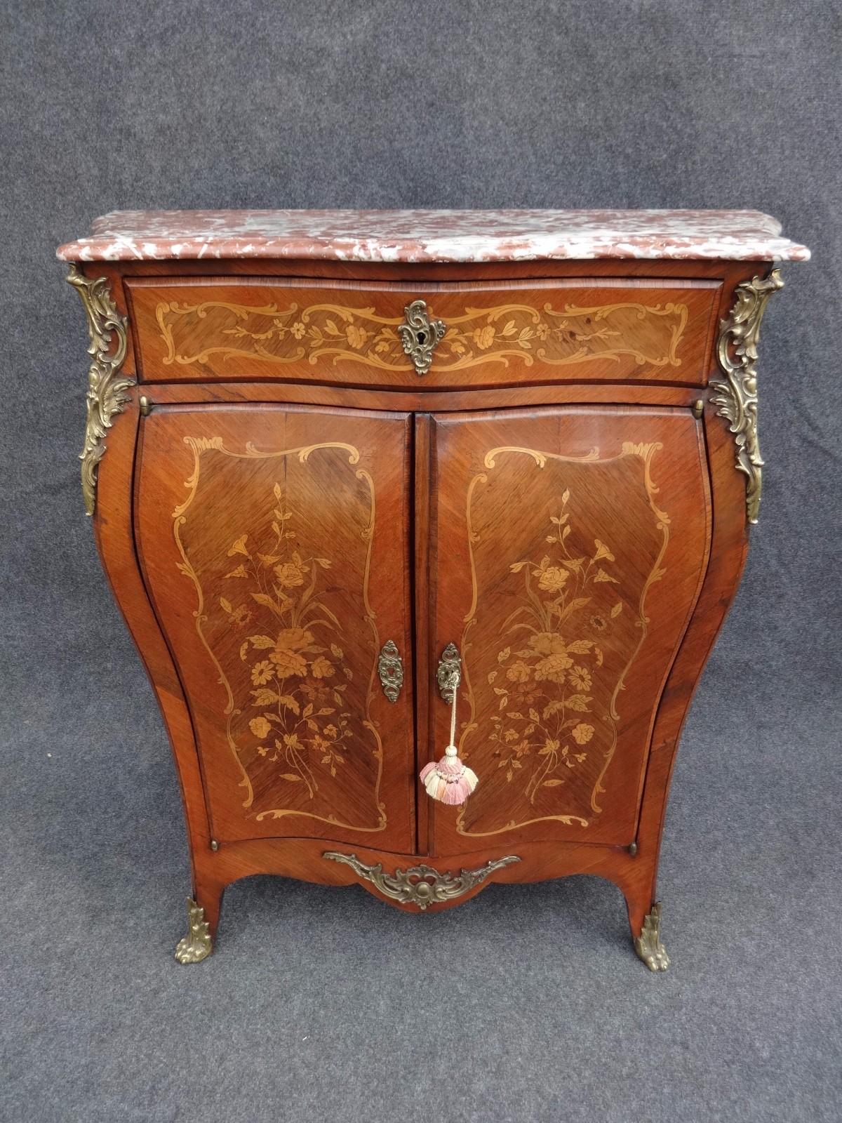 This is a stunning kingwood 2 door cabinet with single drawer, floral marquetry panels, good ormolu mounts and feet, very good original condition. oak lined.