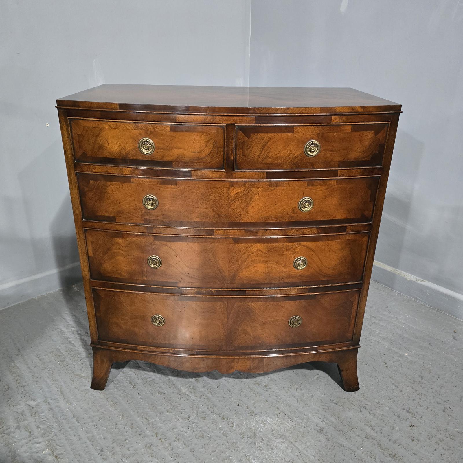 A superior quality Georgian style bow front flame mahogany chest of five drawers, brass ring handles,cockbeaded drawers, oak lined throughout, standing on bracket feet, in excellent overall condition with a woonderful colour.