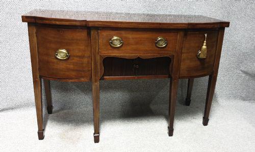 A Good Georgian mahogany inlaid sideboard, bowed front, central drawer with drawer and cupboard either side under tambour sliding doors, good colour and condition, original brass oval handles.