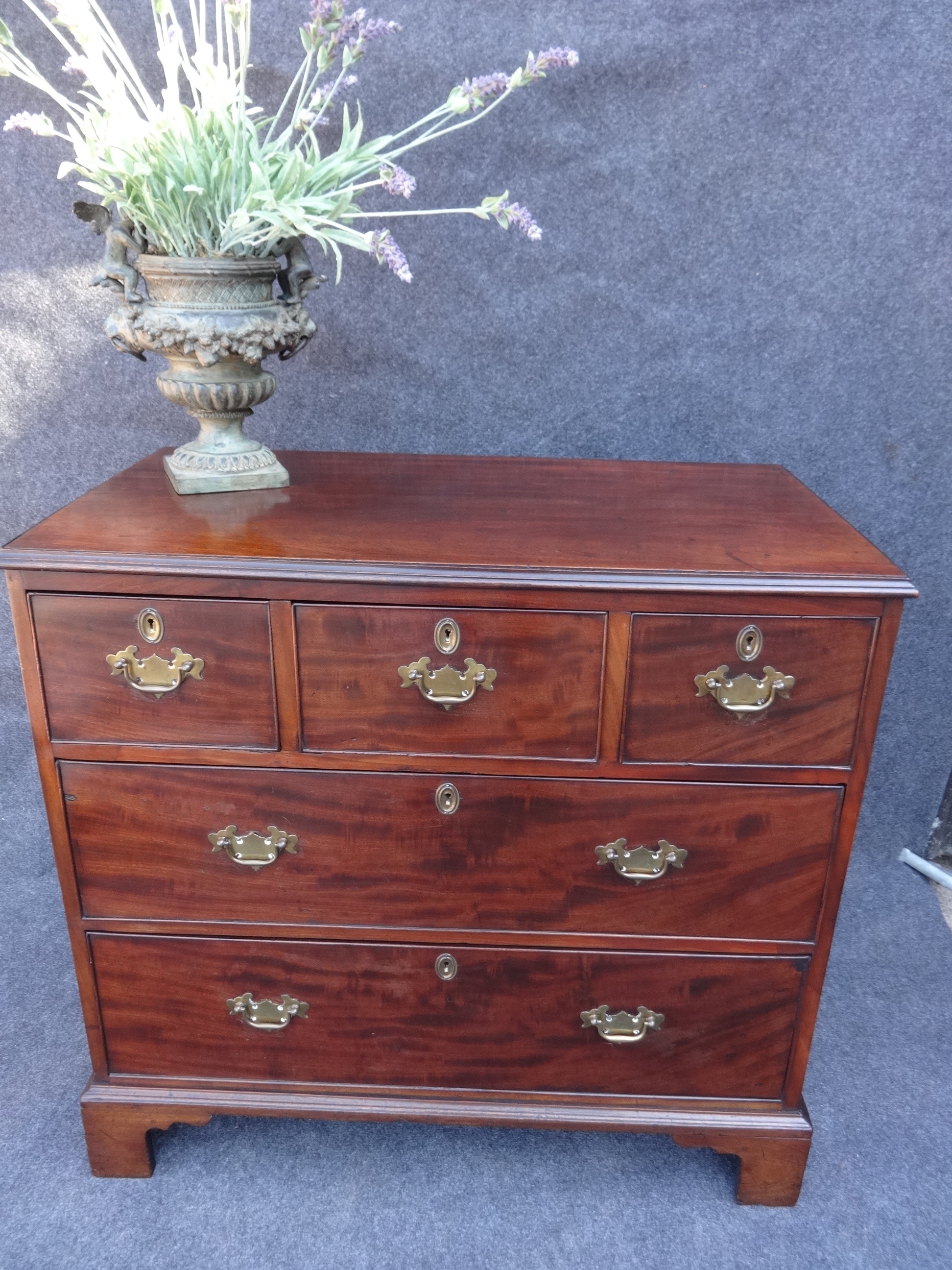 Offered for sale is this fantastic 19th Century antique Georgian chest of drawers of small proportions,. It has 3 drawers across the top, and 2 under, all cockbeaded with original locks, brass handles and escutcheon plates, standing on bracket feet and in very good condition.