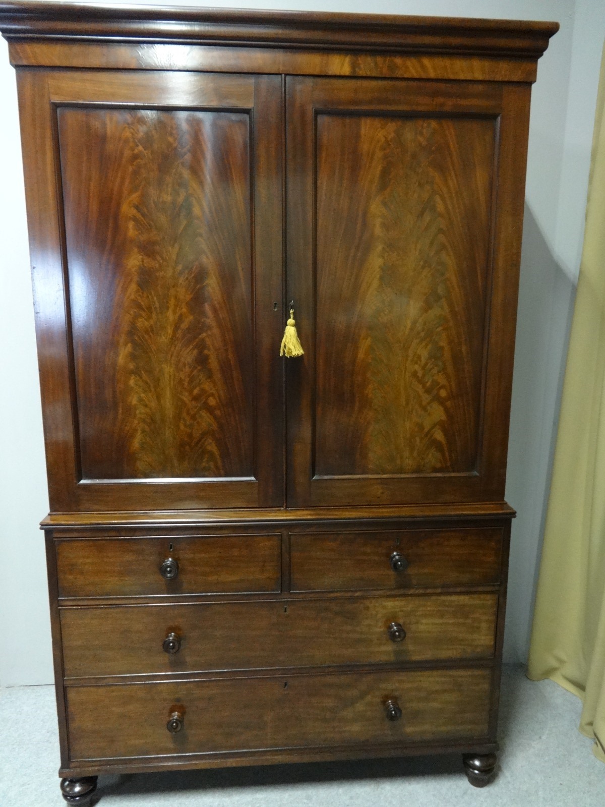An excellent quality solid mahogany 19th Century Georgian antique linen press cupboard, in superb original condition, oak linings throughout. Rail has been added if you require just hanging space.