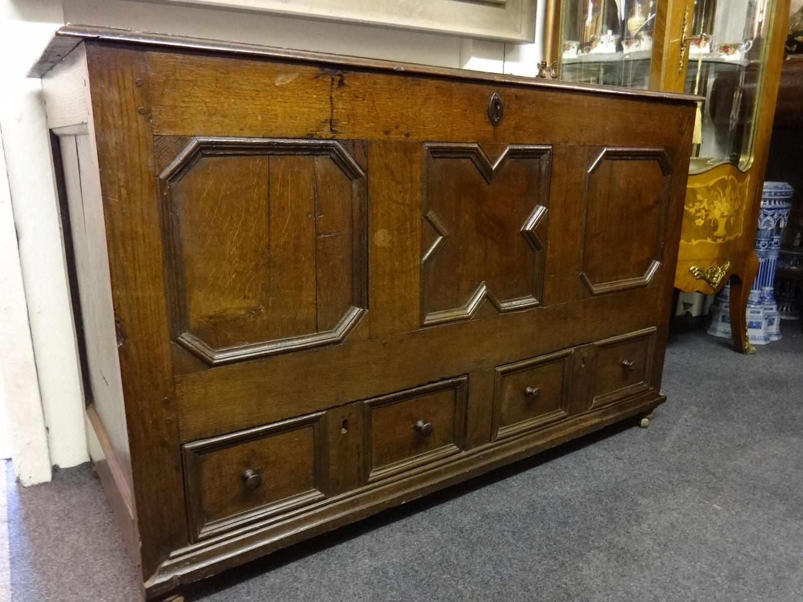 This is a good 18th Century Georgian antique oak mule chest which has 2 drawers to base, geometrical panels, a good colour and in very good condition. It stands on steel castors.