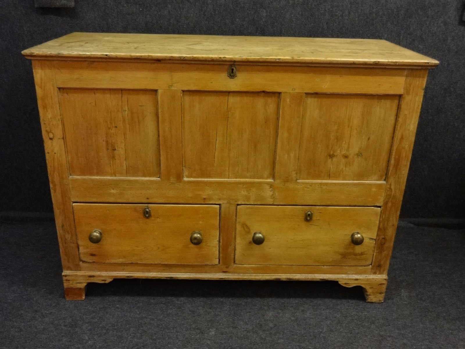 This is a superb 18th Century Georgian antique mule chest with 2 drawers, separate lid which drops into locators, secret candle box which slides out, original lock, drawers with original brass knobs and brass escutcheons. It has a replaced half of front foot.