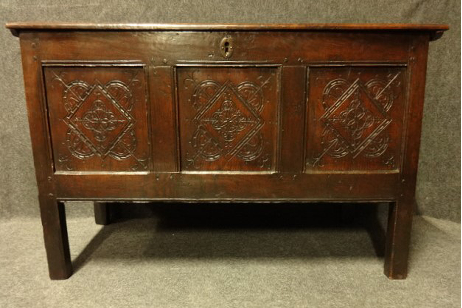 This is a good oak coffer of small proportions, 2 plank top, three panel front, in very good original condition.