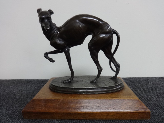 This is a good 19th Century antique bronzed spelter model of a whippet on a mahogany base, excellent casting and in very good condition.