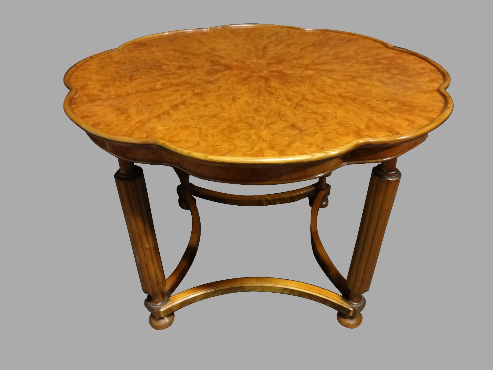 This is a very good burr elm coffee table with lovely petal shaped segmented top, reeded legs and shaped under stretcher.