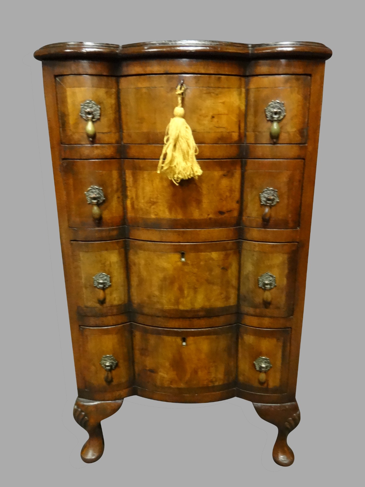 This is a very good antique double serpentine burr walnut chest of four drawers of small proportions, in very good condition, oak lined and brass dropper handles.