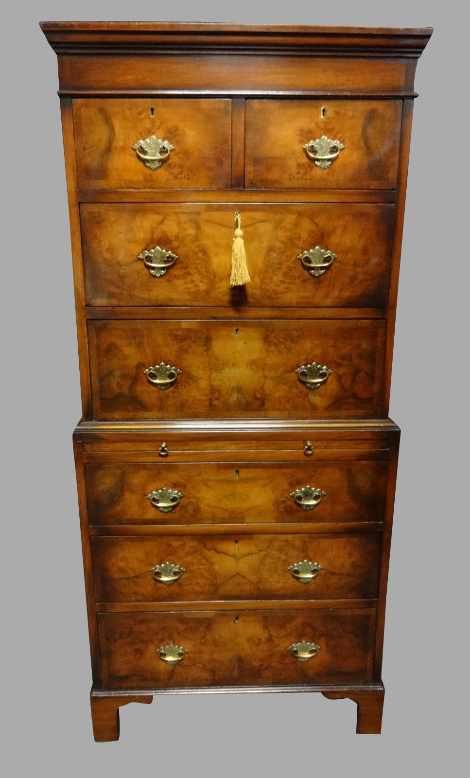 Good Burr Walnut Queen Anne Style Chest on Chest of Drawers