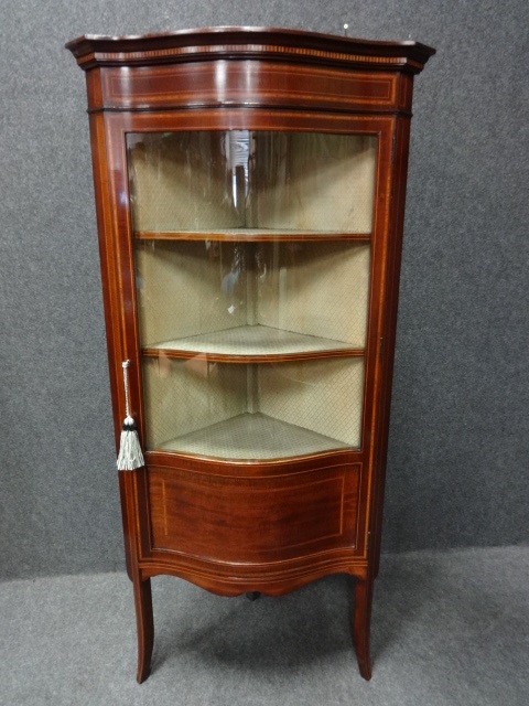 An excellent quality corner display cabinet, serpentine fronted with satinwood inlays, in excellent original condition.
